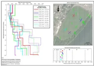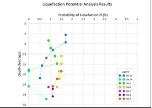 In the final phase, RETTEW performed an LPA using available geotechnical boring data and historical seismic records. The goal was to determine if any subsurface layers could liquefy during the MCE. Given that liquefaction probability above 20% is a concern, all borings modeled from this site fall within the “safe” zone (see Figure 2).